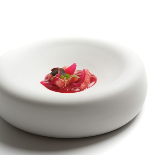 大海與陸地食材的完美結合,選用台灣在地胭脂蝦,以低溫蒸氣熟化1分鐘,呈現滑順鮮甜的口感,一旁搭配醋漬洋蔥,以及蝦頭與甜菜根製成的醬汁,三種不同層次的紅色,展現西班牙的熱情奔放,猶如佛朗明哥舞者跳舞時的迷人姿態。