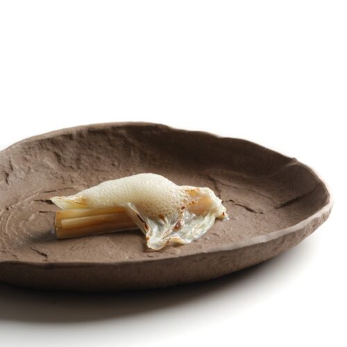 蘆筍是David主廚很喜歡的食材,每年他都很期待西班牙3月底至6月白蘆筍盛產的季節,此次特別帶領賓客品嚐當季採收鮮嫩的白蘆筍,呈現著甜美收穫的滋味。白蘆筍取其最鮮嫩的部位刨成絲,以薑跟萊姆調味後嫩煎,口感鮮脆。白蘆筍發酵後會散發一股奶油香氣,主廚以此為靈感,於白蘆筍上方覆以一層牛奶皮(牛奶加熱後表層凝縮的薄膜),再將剩餘的蘆筍熬煮萃取的汁液打成泡沫覆蓋在上方搭配一起享用。