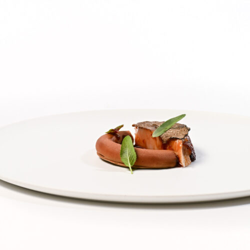 源自南投日月潭紅玉雞,食用台茶18號紅玉紅茶,飲用純淨山泉水成長,雞肉本身帶著紅茶的香氣,飼養過程全程無投藥,更顯健康無憂。嚴選非基改黃豆、玉米,佐以南投在地茶園的有機紅玉紅茶(台茶十八號),展現獨特口感層次和細膩風味。雞胸肉經過舒肥處理後,煎至金黃酥脆,再烤至完美熟度。配以調味黃檸檬、芥末籽、半釉汁和蒜片,增添風味。搭配半圓形雞肝慕斯,外層覆蓋屏東可可粉和雞骨半釉汁。上方點綴檸檬香蜂葉、龍蒿和鼠尾草,增添了視覺與味覺上的層次感。