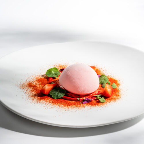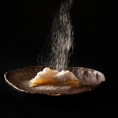 主廚細膩巧思將西班牙經典番茄冷湯凍化而成;「緋」代表了牛番茄和甜菜的豐富紅色調,顏色在慕斯的製作中得到了突顯。「雪」則是討巧如雪球的外形,透過迅速冷凍成球形的技法,賦予番茄冷湯另一種生命力。底部新鮮的北海道海膽和海膽醬增添奢華海洋風味,而自製番茄粉與周圍的香草則提升層次的豐富度。